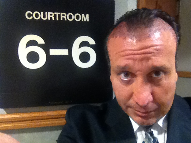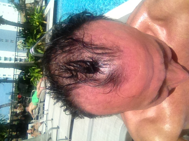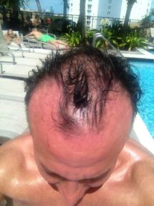 And here is a photo I took yesterday, a month after that court date, where I had just stepped out of the pool, meaning my hair is wet and making me look even balder, showing there is plenty of empty space for the 2,799 hair grafts that Dr. Mejia transplanted to fill.