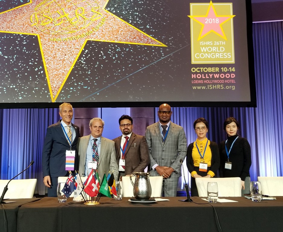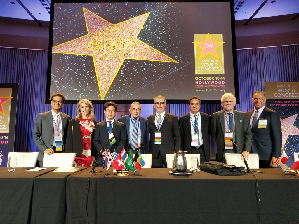 The ISHRS 26th Annual World Congress in Hollywood California was attended by participants from 55 countries. The ISHRS doctors gather annually to share and advance knowledge and techniques to improve the quality of hair transplants worldwide. This years program was filled with knowledge to improve the quality of hair restoration and surgical treatments. Pictured above, at the opening session were Program Chair Dr. Mohebi, executive Director Victoria Ceh, President Dr. Hwang, Keynote Speaker Dr. Rassman, Scientific Chair, Dr. Wolf and Dr. Mejia launching patient safety and awareness campaign with Dr. True and Dr. Harris.
